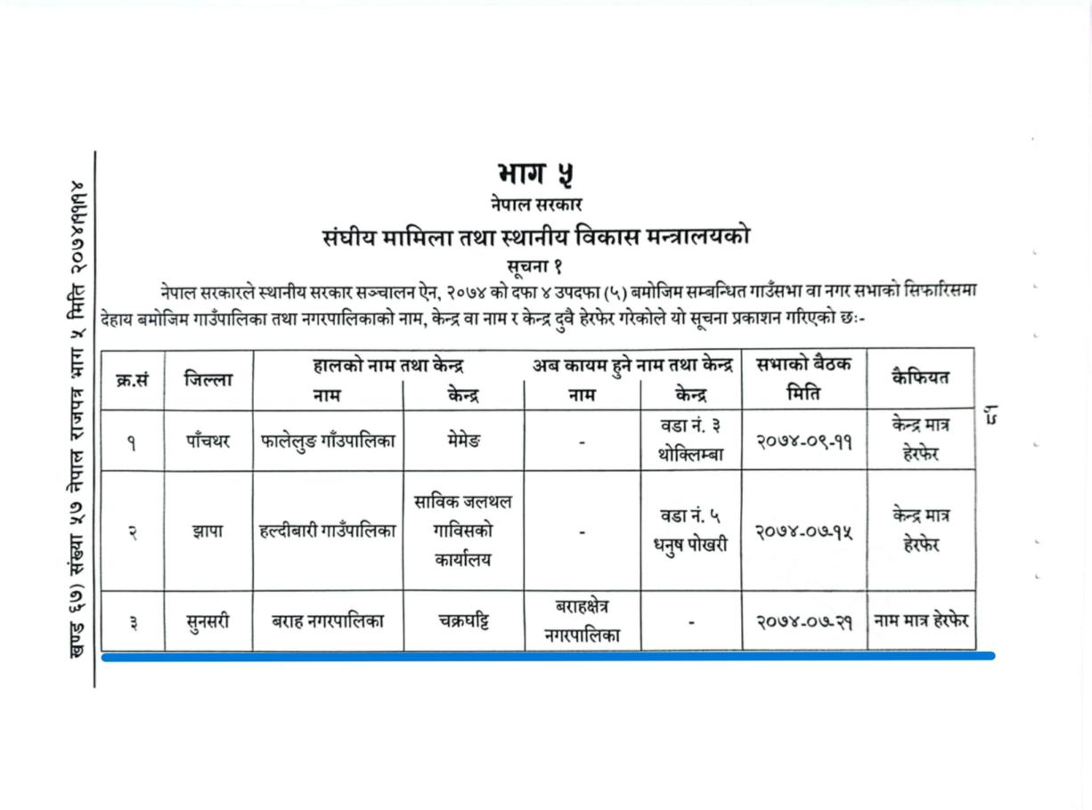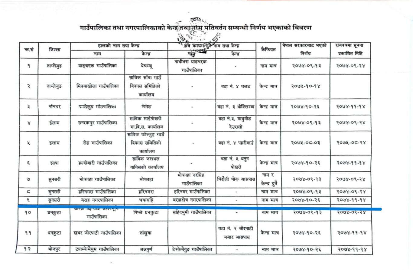 नगरपालिकाको नाम र केन्द्र परिवर्तन मिति